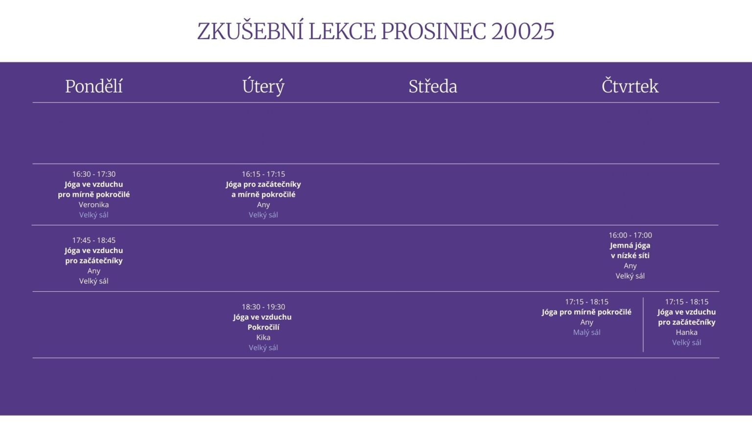 Běžné lekce neumožňujeme navštěvovat dětem pod 17 let. Pro děti máme specializované kurzy, přespávačky s jógou ve vzduchu a příměstské tábory. Na běžných lekcích by se nudily a hrozilo by jim zranění z nepozornosti.
